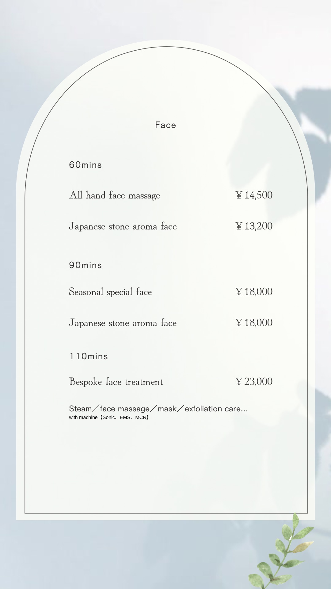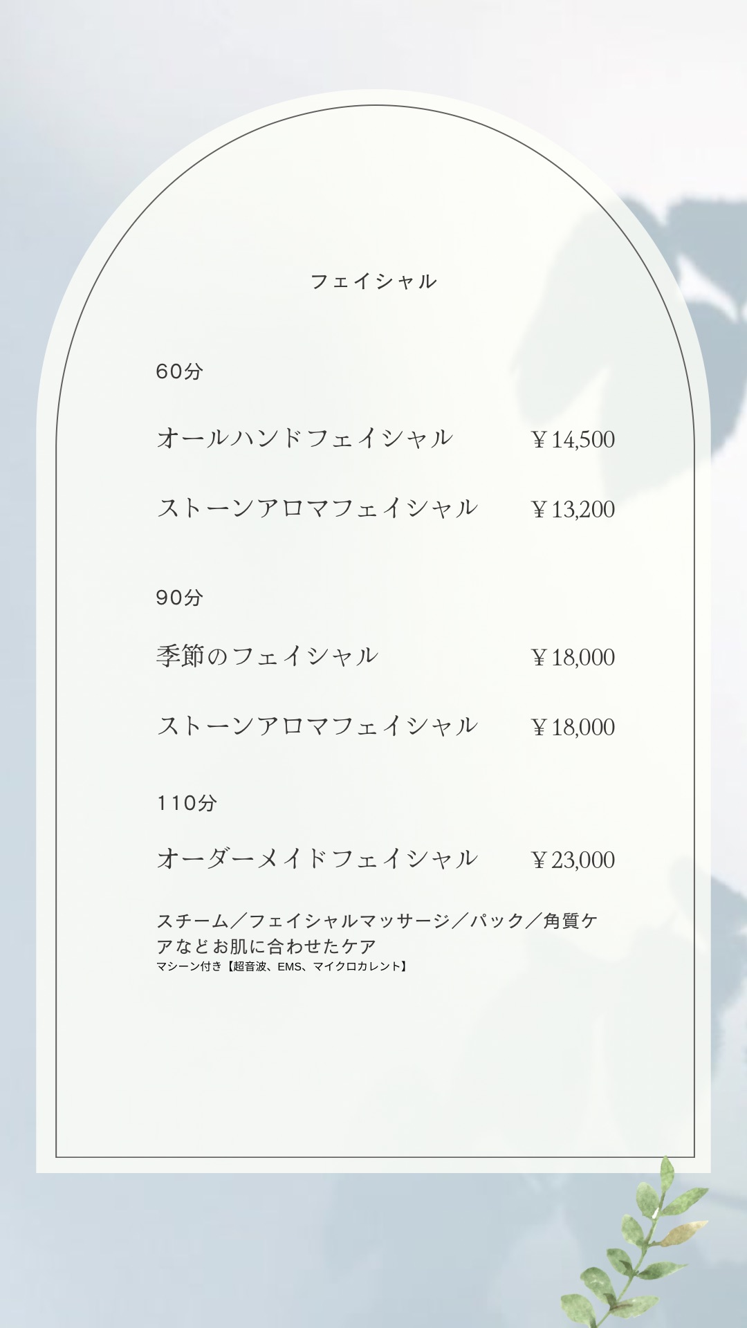 フェイシャルで使用されている機械の種類や詳細はフェイシャルメニューの詳細と種類★こちらからメニュー選びの参考にしていただければと思います。また、オプションページやリピーター様限定のメニューもご用意していますのでご希望などお伝えください。