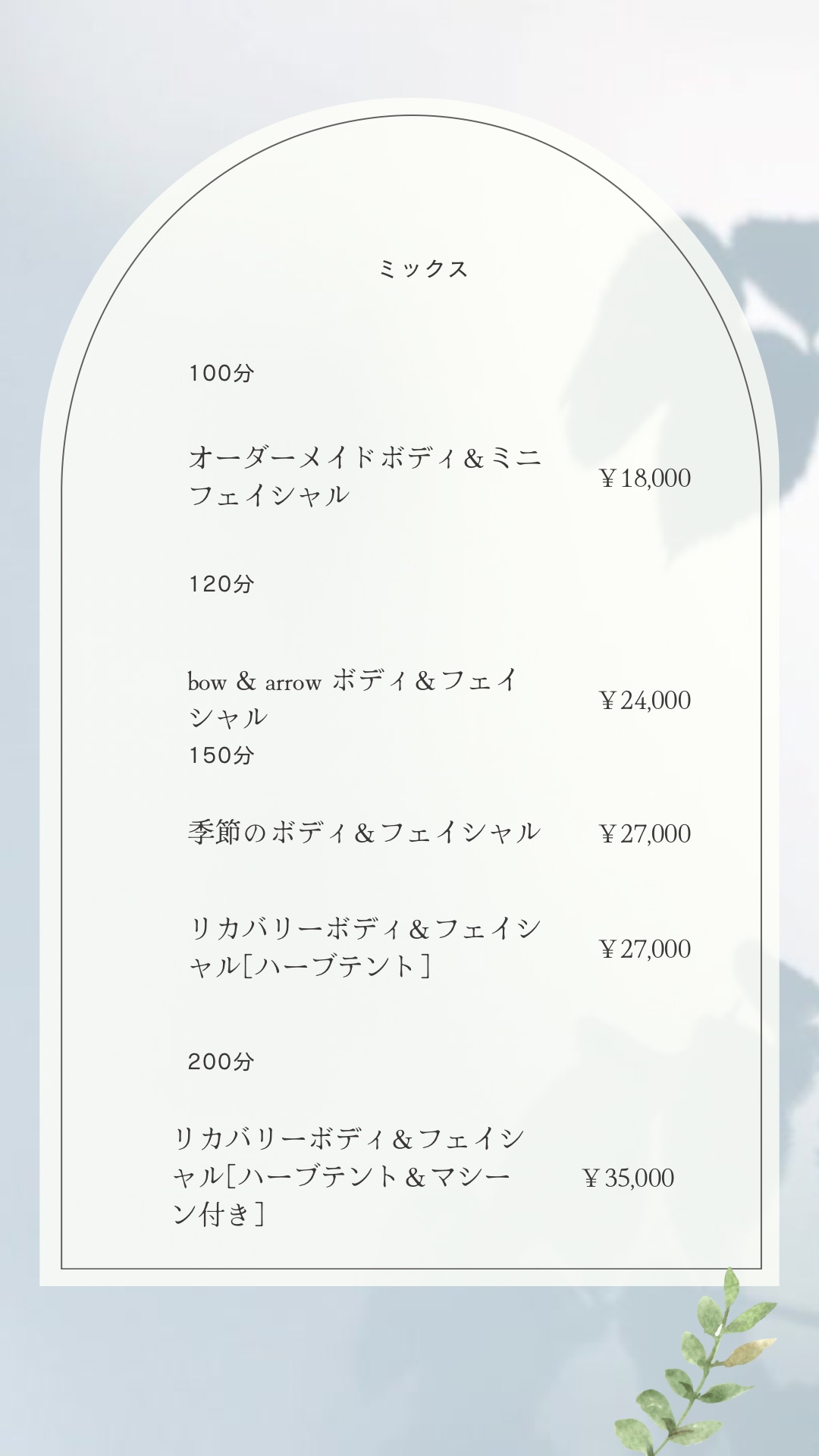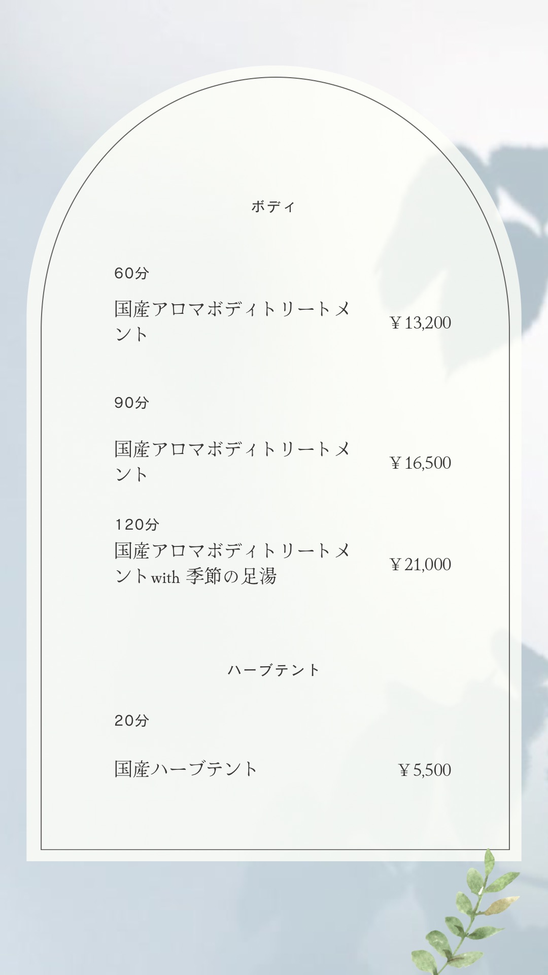 プライベートサロンbow & arrow 神楽坂、当サロンでは、大きく分けてフェイシャル、ボディトリートメント、ハーブテントのメニューがございます。全て国産の厳選された化粧品、オイル、ハーブを使用したメニューとなっております。メニューだけでは、分からないこともあるかと思いますので、事前のご予約や当日のカウンセリングで詳細を決めることも可能です。内容によっては少しお時間を頂く場合もございますがお気軽にご相談ください。