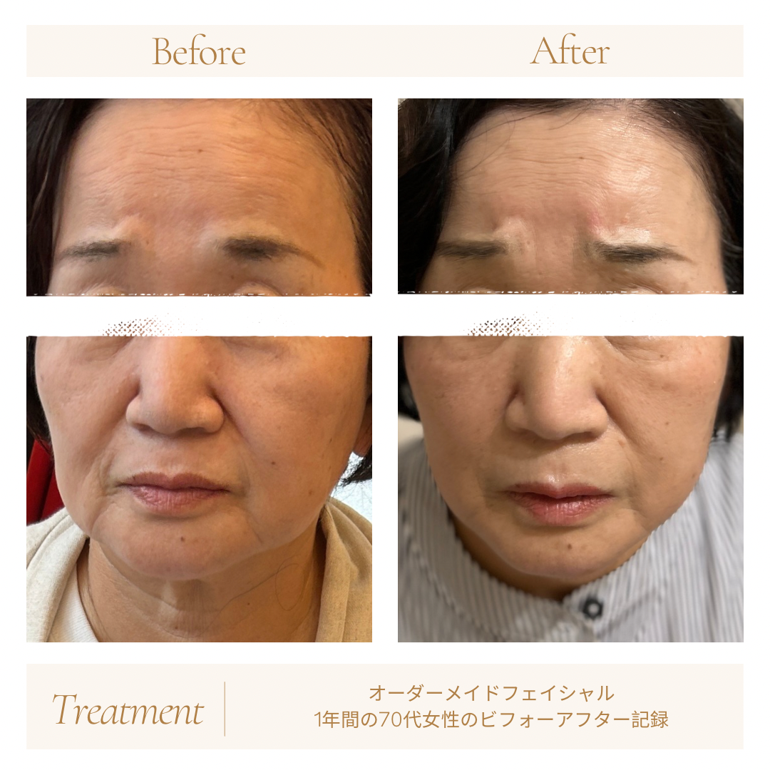 70代というエイジングに悩まれていてたお客様で特にフェイスラインのたるみを気にされていました。こちらは前後ともメイクをした状態となり、化粧ノリの違いは明らかです。年齢的に水分油分が減ってきたりと、エイジングを完全に止めるということは難しいことですが、施術の毎回のお手入れ入れにより見た目でも艶が出ているのと乾燥に伴う細かいしわも見えにくくなってきたという事例です。美容医療の施術とは違い自然なエイジングケアを実現されたお客様です。
