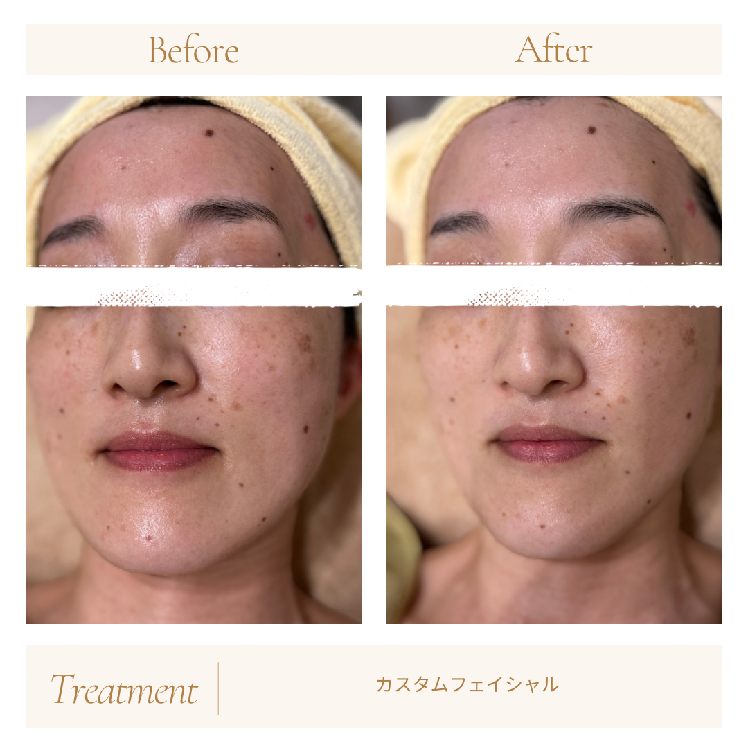 40代後半のお客様です。初めての施術ということで日差しがつくなってきた時期でもあり乾燥気味なお肌でした。保湿ケアが重要なことと、冷えもあったため循環を整えるお肌へとまずは整えていきました。また、お肌の色が本来のお肌に比べると暗くなっていたためお顔の巡りを整える重点的にハンドマッサージとSONICを使用しました。ハンドで触れられる部分とマシーンによりハンドだけでは触れられない深層の部分を一緒にケアをし健康的なお肌へと近づいていきました。こちらは1回での施術の結果になります。巡りを整えることで肌の色のむらやお肌の肌感に変化をもたらし驚きを感じていただける方も多いのが特徴です。